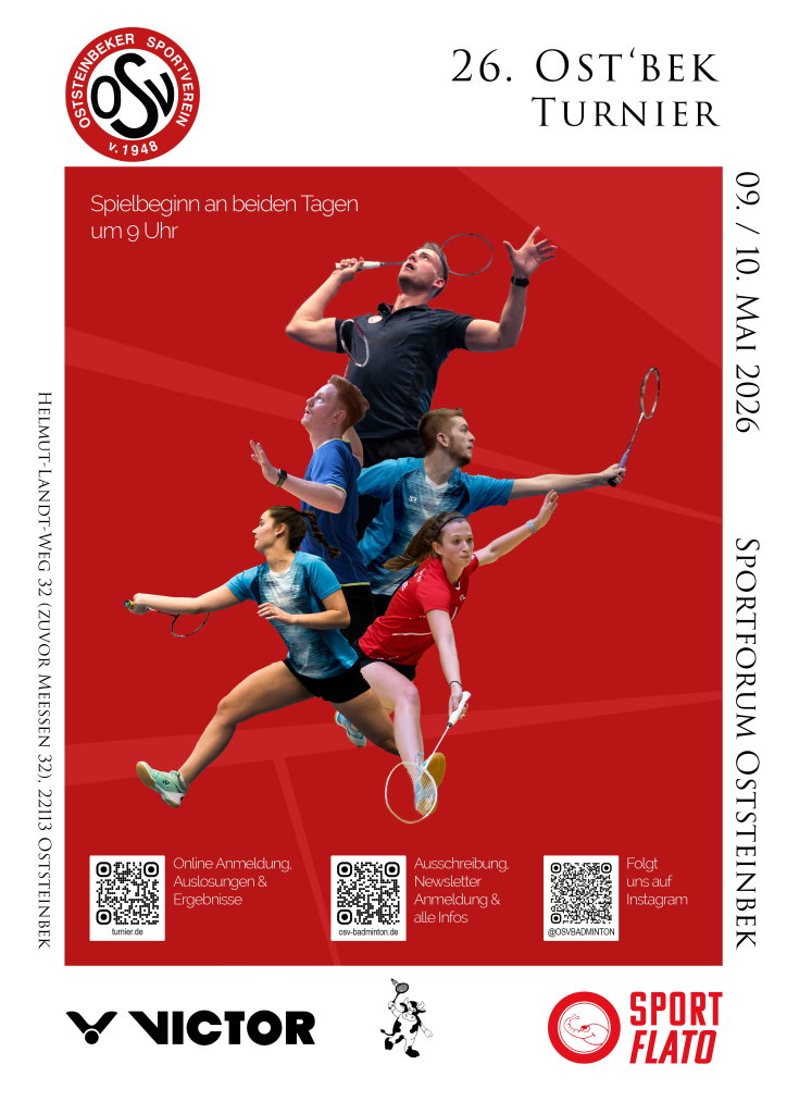 | Meldung: | Meldung ausschließlich Online über www.dbv.turnier.de (26. Ostbek Turnier | Deutscher Badminton Verband) möglich |